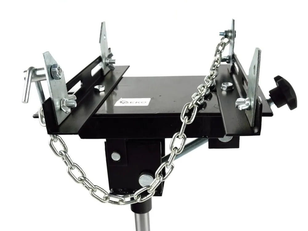 Adaptér pro pracovní zvedák převodovky, s řetízkem, nosnost 600 kg. Adaptér k pracovnímu zvedáku převodovek GEKO G02102Max. nosnost: 600 kgDeska je stavitelná – možnost přizpůsobení momentálním potřebám (šroub s motýlkem).Pevný řetěz pro zabezpečení převodovky.